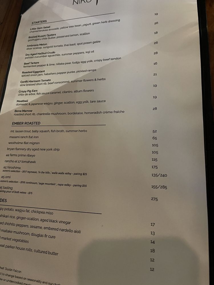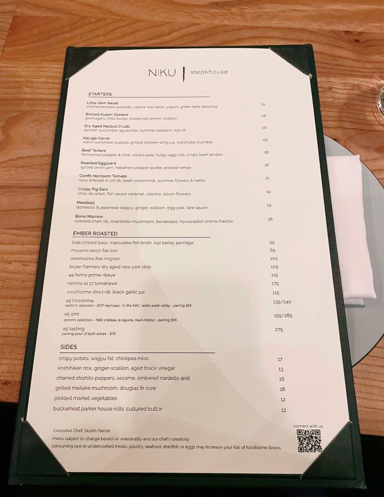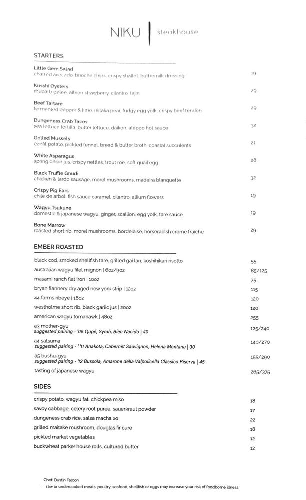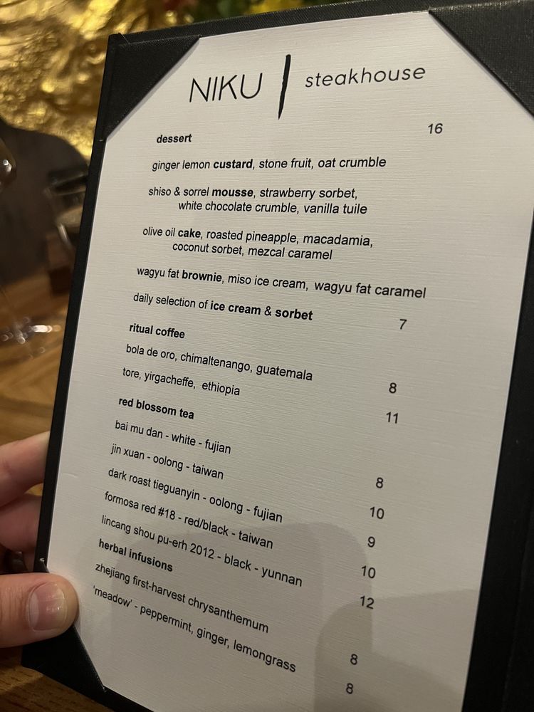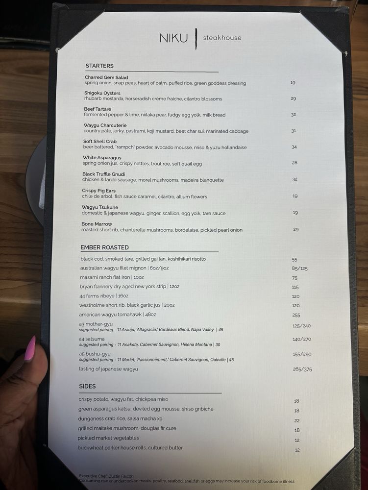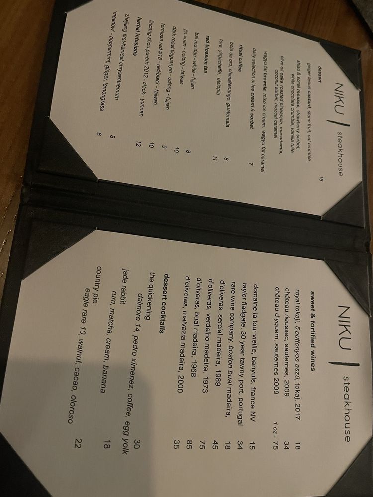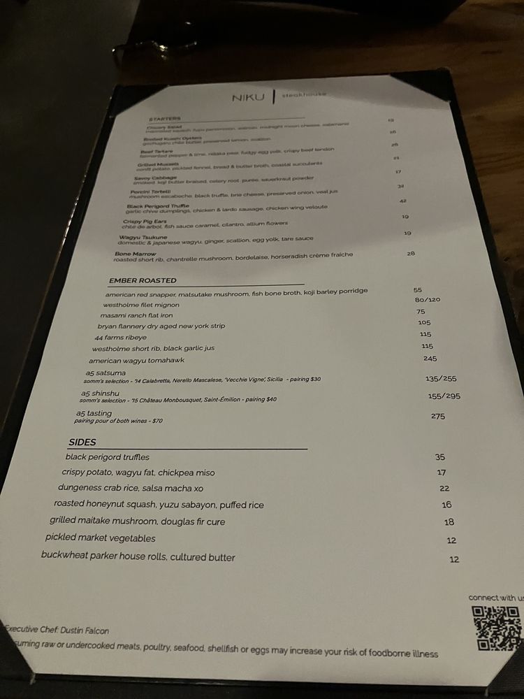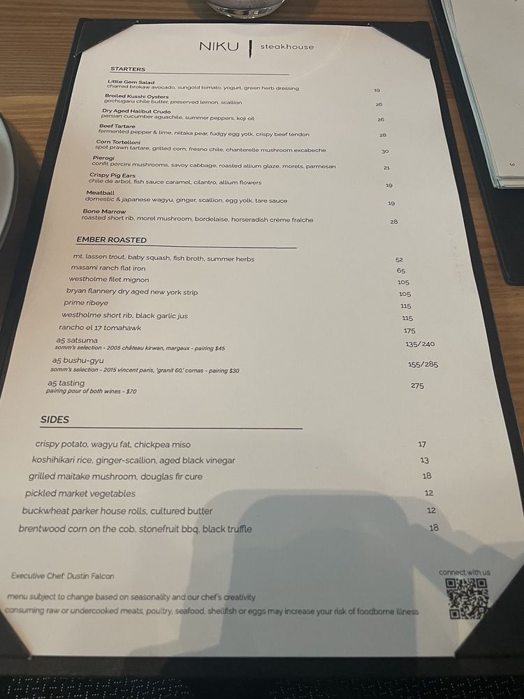 Introducing the menu at Niku Steakhouse, a Michelin-starred Japanese steakhouse in San Francisco, offers a unique and upscale dining experience. The extensive spirits list impresses with many Japanese whiskeys to choose from. The service is attentive, making every dish delicious and beautifully presented. Highlights include the crispy pig ears with chili de arbol, fish caramel sauce, and cilantro leaves, the 44 farms ribeye, and the grilled broccolini with smoked mussel bagna cauda. The ambience blends modern elegance and intimate comfort, setting the stage for a culinary journey that delights all the senses. The wine list is robust and thoughtfully selected, enhancing the dining experience. Niku Steakhouse is not just a place to eat but a destination for refined and memorable gastronomic adventures.
